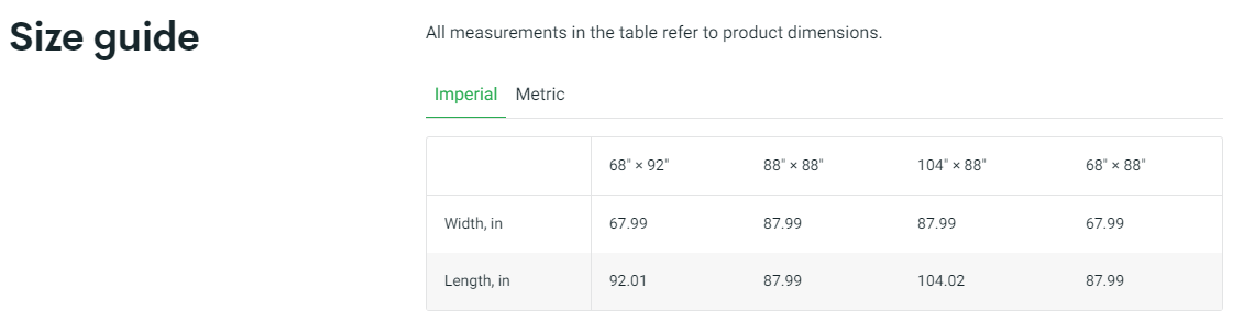 | 68" × 88" Twin | 88" × 88" Full/Queen | 104" × 88" King | |